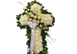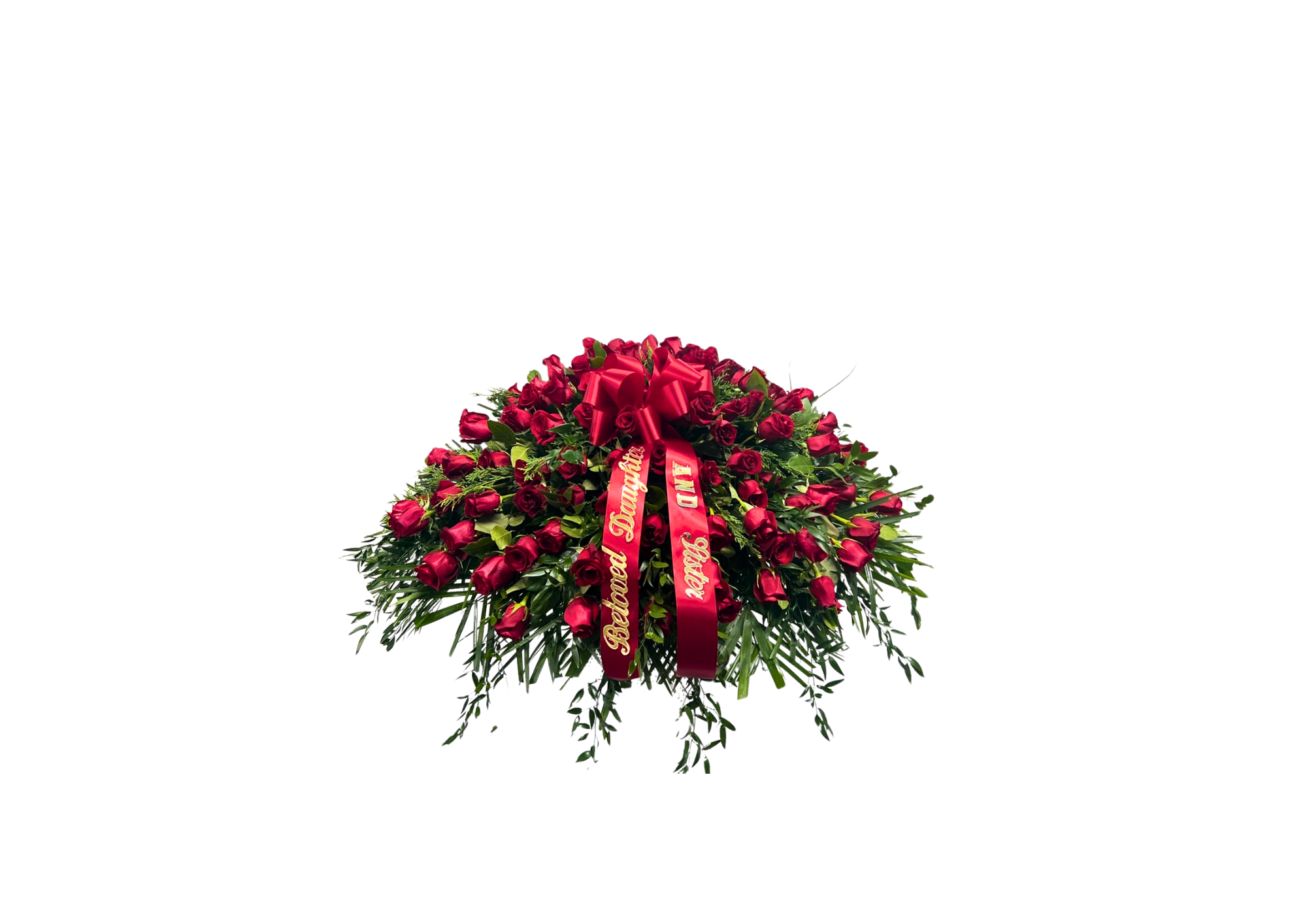 A traditional casket spray of deep red roses and lush greenery expressing respect, honor, and enduring love.