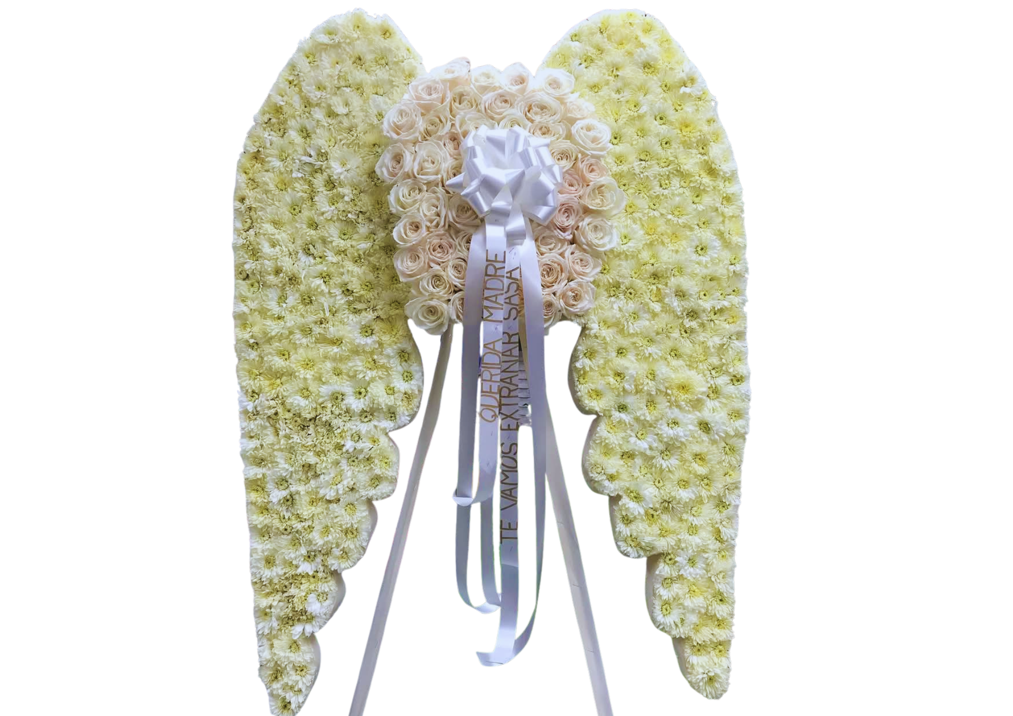 Angel wing–shaped floral tribute in soft ivory and yellow tones, symbolizing peace, protection, and a soul’s ascent.