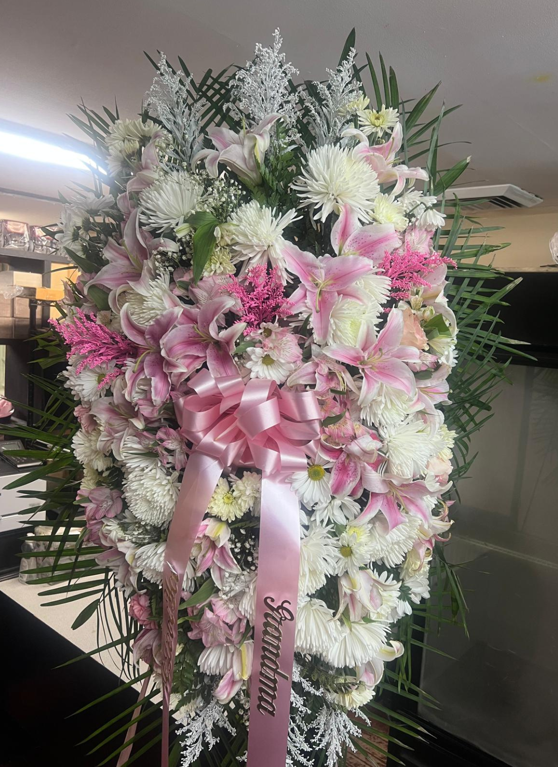 A stunning standing wreath designed with soft pink lilies, white chrysanthemums, and fresh greenery. Finished with a delicate pink ribbon for a graceful tribute. Perfect for funerals, memorial services, and celebration-of-life ceremonies.